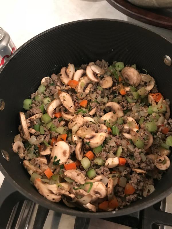 Cook sausage celery and onion in large skillet over MEDIUM-HIGH heat 8-10 minutes or until sausage is thoroughly cooked stirring frequently. Preheat oven to 325F. Add mushrooms onion carrots celery.